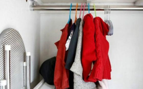 ملابس ابنة نوماهاتا معلقة على شماعات ملونة قبال حائط أبيض.