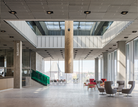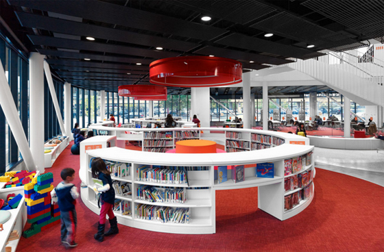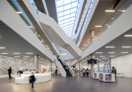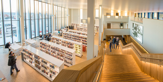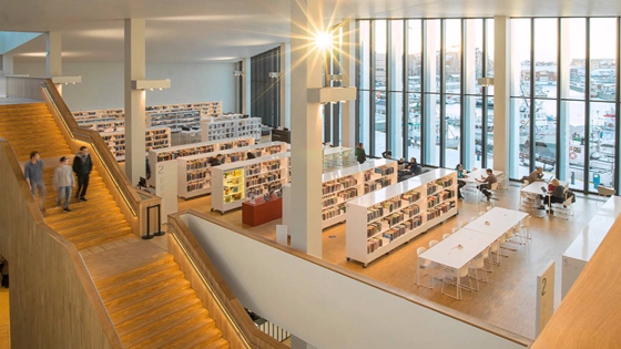 1- مكتبة Dokk1: حصلت مكتبة Dokk1 مؤخرا على جائزة أفضل مكتبة عامة في عام 2016، وتعتبر أكبر مكتبة ضمن الدول الاسكندنافية حيث تبلغ مساحتها حوالي 30 ألف مترا مربعا، وتقع بجانب النهر في آرهوس بالدنمارك. وصمم المبنى بواجهة هندسية صلبة مع نوافذ تطل على ميناء المدينة، كما يوجد جرس فوق الدرج المركزي متصل مع المستشفى القريب ليرن في كل مرة يولد فيها طفل جديد.