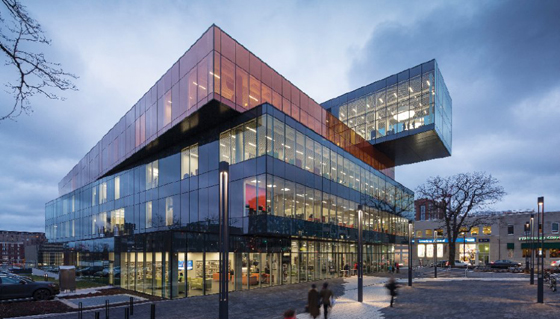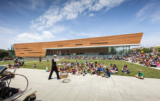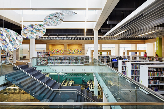 7- المكتبة العامة في شيكاغو: تقع ضمن الحي الصيني الجديد في شيكاغو، أمريكا، وتدخل في تصميم المبنى عوامل التظليل الشمسي من أجل خفض درجة الحرارة في الداخل، وصمم المبنى ليكون متماشيا مع الأجواء خارج المكتبة.