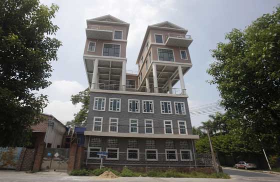 6- منزل كبير يحمل منزلين أخرين على سطحه في دونغقوان بمقاطعة قوانغدونغ، وبناؤه على الأرجح لم يكن قانونيا