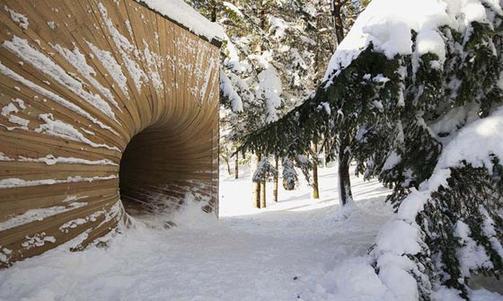 صنع مدخل هذا الكوخ الهادئ على شكل نفق مصنوع من ألواح خشب الصنوبر الملتوية, ويختبئ مدخل المنزل في غابة صنوبر خلف الأشجار.