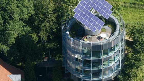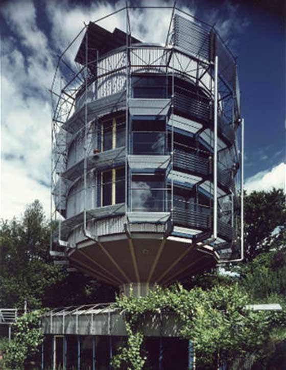 منزل "Heliotrope" في ألمانيا، من تصميم المهندس المعماري الألماني رولف ديش. ويلتف المنزل على بعضه خلال اليوم، بينما تتبع مناطق المعيشة في المنزل اتجاه ضوء الشمس