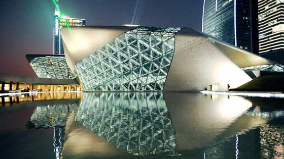 2.الصين: بُنِيَت دار أوبرا "غوانزو" في مقاطعة "غونغدنغ" في الصين. وبلغت تكاليف بنائها قرابة 200 مليون دولار والدار من تصميم المهندسة العراقية "زها حديد"، وقد استغرقت عملية إستكمال بناء القاعة الرئيسة قرابة الخمس سنوات، وحاز البناء على جائزة التصاميم المعمارية، كما حظي بإعجاب الكثير من المهندسين حول العالم.