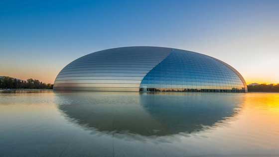4. بكين: بُني المركز الوطني للفنون المسرحية في العاصمة الصينية "بكين" على مساحة تُقَدر بـ 220 ألف متراً مربعاً قرب ساحة "ساحة تيانانمن "، افتتح المركز عام 2007 ويُعتبر أحد أهم معالم العاصمة، ويحتوي على قاعة كبيرة لعروض الأوبرا، وهناك قاعة كبيرة أخرى لتقديم شتى أنواع الفنون المسرحية. أشرف على بنائه المهندس الفرنسي "بوول آندرو".