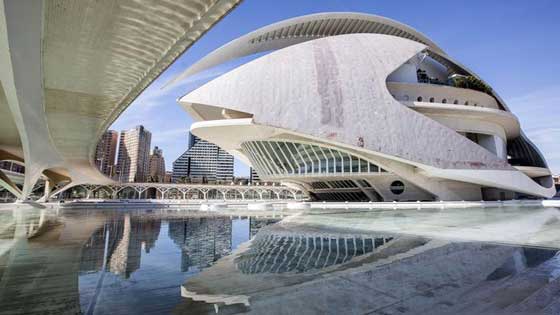 5. إسبانيا: دار الأوبرا "بالاسيو دي لاس آرتس رينا صوفيا" في إسبانيا صممها المهندس"سانتياغو كالاترافا". أقيمت الدار إلى جانب مركز علوم المحيطات، وحوض الأسماك ومتحف العلوم وتهيمن القبب على سقوف المركز الذي يتميز بجرأة التصميم. ويتكون المبنى من مرافق للتعليم والفنون والنشاطات الثقافية.