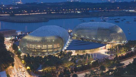 7. سنغافورة: تبلغ مساحة مسارح " إسبلانيد" على الخليج في سنغافورة حوالي 60 ألف متراً مربعاً. ويضم المبنى مركزاً للفنون ويقع على خليج "مارينا" قرب مصب نهر سنغافورة، وهناك قاعة كبيرة مُخصصة للموسيقى تتسع لقرابة 1800 شخص. قام بتصميم البناء المهندس "راسل جونسون"، وبلغت تكاليفه حوالي 600 مليون دولار.