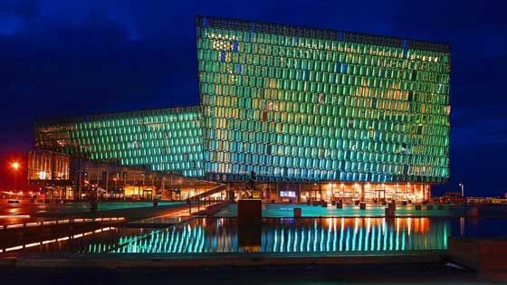 8. آيسلندا: يعكس بناء "هَارب" أو قيثارة الألوان في "ريكيافيك آيسلندا"، ولع وشغف الفنان "أولافر إلياسون" بالأضواء، قام إلياسون بتصميم واجهة البناء من الزجاج الملون الذي يشبه مكعبات أقراص العسل، ففي فترة النهار يشتت الزجاج الملون الأضواء وأثناء الليل يعكس الزجاج تلك الأضواء بشكل ساحرعلى صفحة مياه الميناء الداكنة.
