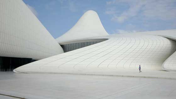 10. باكو: هذا هو مركز "حيدر علييف" الثقافي الذي بُني في مدينة "باكو"عاصمة أذربيجان، صمم المركز المهندسة المعمارية "زها حديد"، وقد افتتحه الرئيس الحالي "إلهام علييف" في الـ 10 من أيار/ مايو 2012.