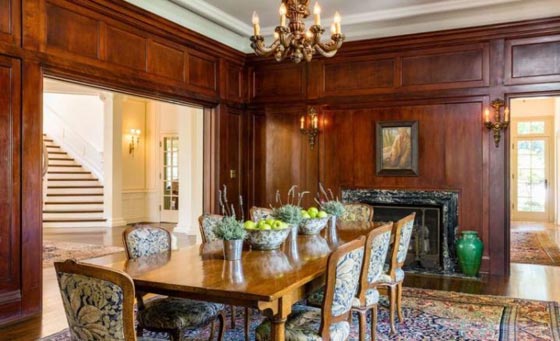 - غرفة الطعام ذات الأرضيات والحوائط الخشبية، وتتميز بطاولة طعام بشكل كلاسيكي خلاب.