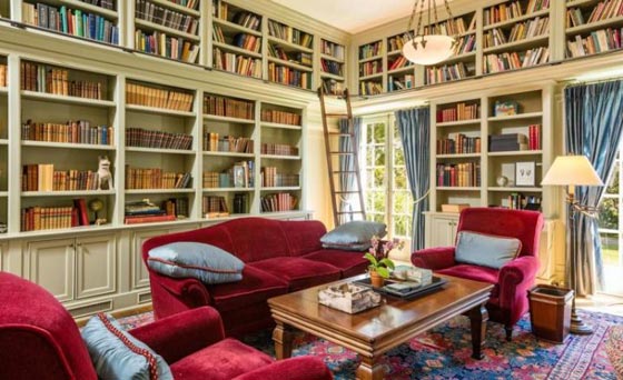 - إحدى غرف القصر تحتوي على مكتبة عملاقة مليئة بالكتب، وتضم “أنتريه” من الشمواه الأحمر.