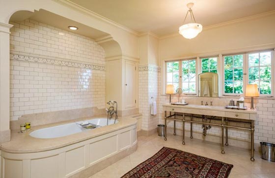 - يحتوي القصر على عدة حمامات، منها هذا الحمام ذو الحوائط والأرضيات الفاتحة.