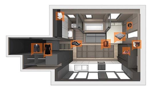 الأثاث نفسه يمكنه أن يمتد ليكشف أدوات متعددة الإستخدامات، فالمساحة الواحدة يمكن استخدامها لأغراض متعددة.