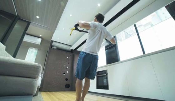 ويقول المهندسون المشرفون على المشروع: "المساحة تدل على الرفاهية، لذا قررنا بأن نزيد منها في هذا المنزل،" وهنا يمكن رؤية ما يمكن فعله بالسقف ليساعد على ممارسة الرياضة والحصول على ناد رياضي مصغّر في المنزل.