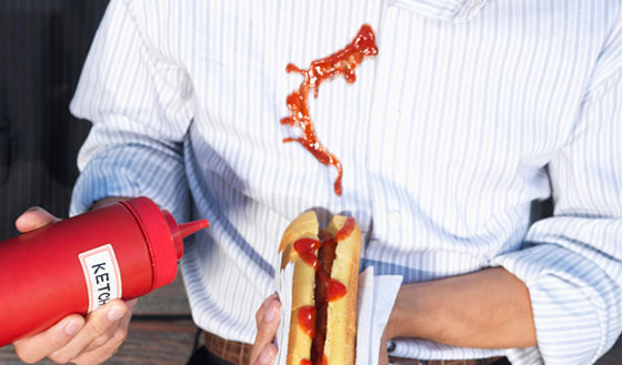 1. بقعة الكاتشب أو الصلصة: قم بإزالةالبقعة بمنديل ورقي أولًا، ثم أضف مزيل بقع واتركه 5 دقائق قبل غسل قطعة الملابس في الغسالة بالمسحوق التقليدي وعلى ماء بارد.