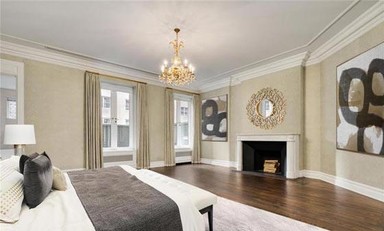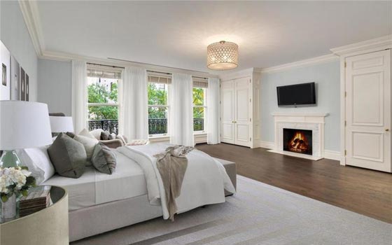 تحكم الأناقة مكوِّنات غرفة النوم الرئيسة، حيث يبدو السرير المزدوج نقطة الارتكاز فيها. ويحتلُّ الأخير مساحةً تقابل الموقد المثبت على الجدار الرئيس المطلي باللون العسلي الفاتح، تعلوه مرآة مُزوَّدة بإطارٍ جذَّابٍ.