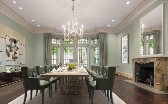 اعتُمد اللون الزيتي ومشتقَّاته في تصميم غرفة الطعام الفسيحة. وفي هذا الإطار، تتلوَّن الجدران بالأخضر الفاتح، ما يُحقِّق لمسة لافتة في الأرجاء، بمعيَّة الكراسي الجلد الزيتية المزوَّدة بظهور مُكبَّسة بالأزرار. وتصطفُّ الكراسي على جانبيِّ طاولة الطعام المستطيلة المُعدَّة من الخشب الفاتح، مع الإشارة إلى غياب الكرسي الذي يترأس الطاولة في العادة، بهدف إظهر تصميم قاعدة الطاولة المشغول بإتقان.