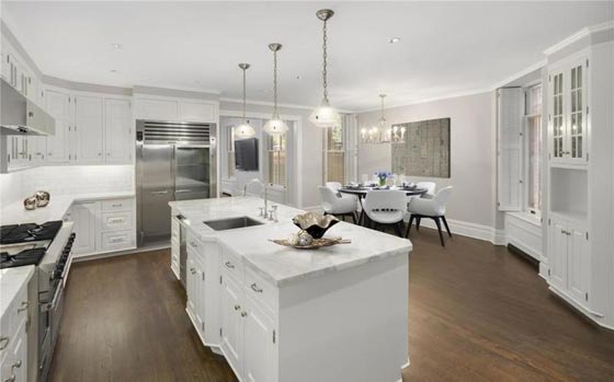 يتألَّق المطبخ ببياضه، وهو يشي بالرفاه، ويحظى بمساحة رحبة تحضن "جزيرة" تتدلَّى فوقها وحدات إضاءة ثلاث بسيطة في تصميمها. كما يُشكِّل المطبخ ملتقًى لأفراد العائلة، نظرًا إلى حضور طاولة دائرية مُخصَّصة لتناول الفطور الصباحي في إحدى زواياه.