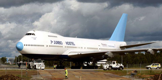 Jumbo Stay، السويد: يقع بيت الشباب Jumbo Stay عند مدخل مطار ستوكهولم أرلاندا في السويد، ويقع داخل نموذج جامبو من طراز 747-212B من عام 1976. تم شراء الطائرة في عام 2006 وتم سحب جميع المقاعد الـ 450 من أجل تثبيت مساكن على غرار غرف النوم، وهناك أيضا عدد من الغرف الخاصة. في المجموع هناك 76 غرف، إحداها توجد في قمرة القيادة، وتبدأ أسعار الإقامة في الطائرة من حوالي 38 جنيهًا إسترلينيًا في الليلة.