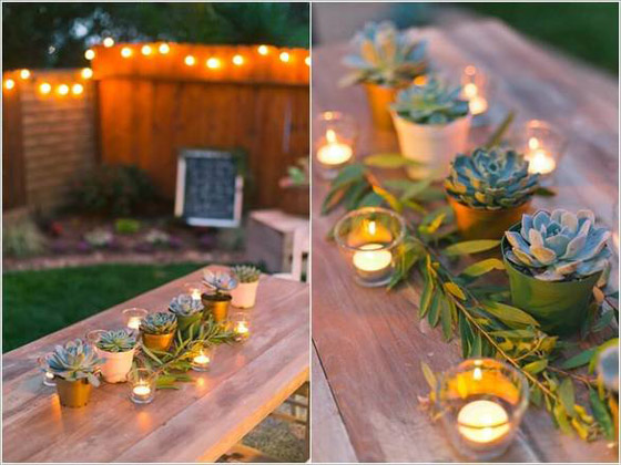 1- يمكن تصميم نقطة مركزية في الحديقة باستخدام مجموعة من أصص النباتات والشموع لحفلة رومانسية.