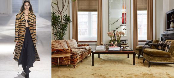 * معطف أنيق من الفرو البني المخطط مشابه لفرو النمر، ينعكس في تصميم غرفة المعيشة بهذه الأرائك الجميلة *