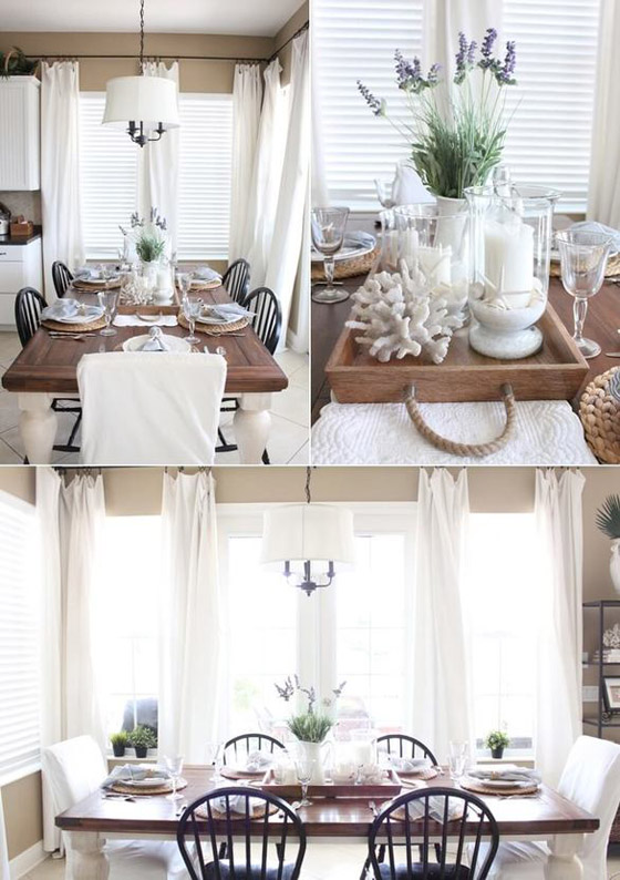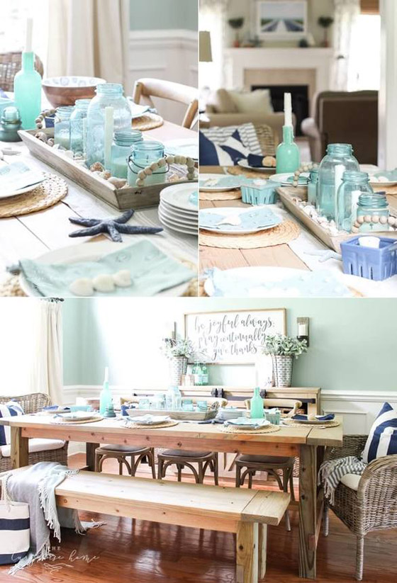 3- زينة لطاولة العشاء مستوحاة من أجواء البحر والشاطىء مع الأزهار والشموع.