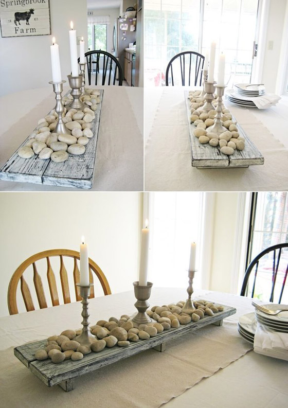 9- طريقة فنية لتزيين الطاولة باستخدام الحجارة الملساء والشمعدانات.