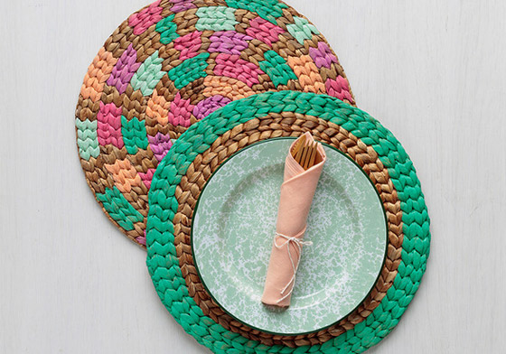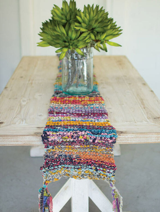 6- تزيين طاولة الطعام بسجادة منسوجة من مجموعة من أشرطة القماش الملونة.