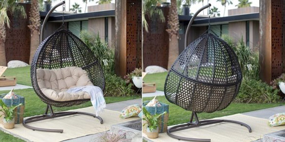 3- كراسي مناسبة للجلوس في الحديقة على شكل نصف بيضة من الأسلاك والأنابيب المعدنية.