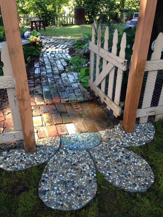 1- تزيين الفناء الخلفي للمنزل بلوحة من الفسيفساء الملون على شكل زهرة ضخمة.