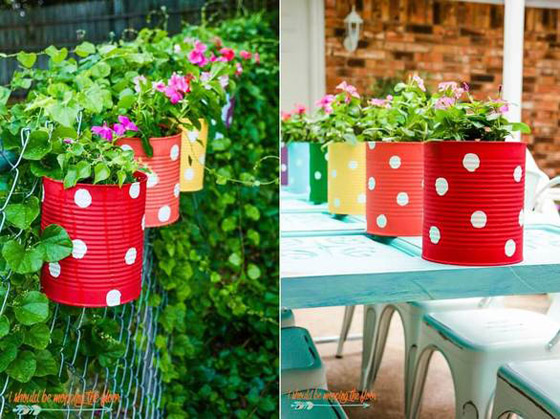 3- طلاء مجموعة من عبوات المعلبات بألوان زاهية واستخدامها لزراعة النباتات والأزهار.
