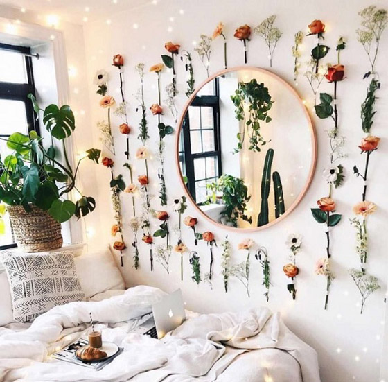 5- تزيين مرآة غرفة النوم بطوق كبير من الازهار الملونة والمصابيح الصغيرة.