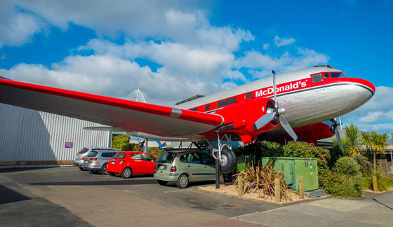 7. McDonald’s، تاوبو، نيوزيلندا: واحدة من مناطق الجذب في مدينة تاوبو، في نيوزيلندا، وهي فرع لمطعم ماكدونالدز تحول إلى وجهة سياحية لوجوده على متن طائرة Douglas DC-33. خدمت هذه الطائرة خلال الستينيات قبل أن تتقاعد، لتعود للحياة من جديد في التسعينيات ولكن كمطعم للوجبات السريعة عندما أعيد تشكيلها لاستيعاب حوالي 20 شخصاً. بالنسبة للطعام.. حسناً، قائمة ماكدونالدز معروفة عالمياً!.