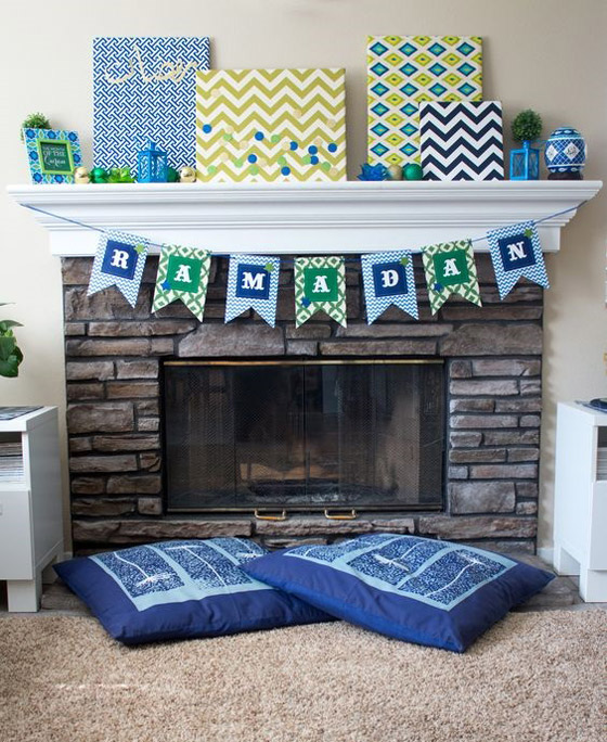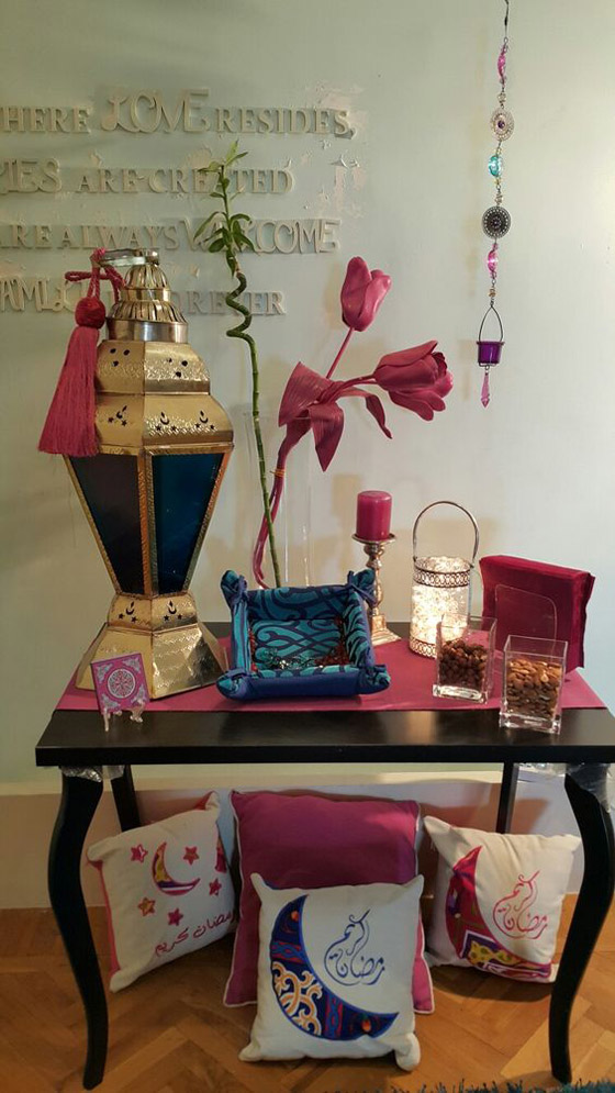 1- قومي بتصميم أغطية للوسادات الأنتريه الصغيرة مصنوعة من تصميمات الخيامية بألوان الأزرق والأحمرن كذلك صممى مفرش لطاولتك الصغيرة من نفس القماش وضعى عليه فوانيس رمضان.