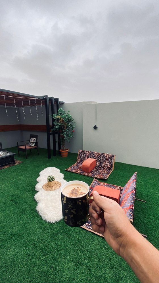 وفي نهاية حديثه وجه متعب العنزي نصيحة لمتابعيه الذين يريدون استغلال مساحة أسطح منازلهم في الابداع وابتكار استراحات فريدة ومدهشة قائلاً: “بالاخير نصيحه مني اذا عندك مساحه بالحوش بالسطح حاول تستغلها ولايهمك كلام الناس اللي تحاول تحبطك .. صدقني بيكون لك وقت جميل فيها وتغيير عن جو البيت والغرف “.