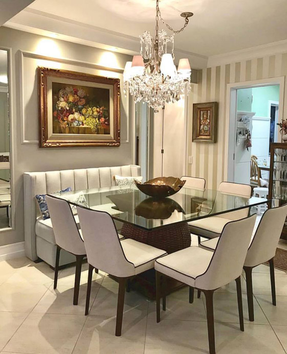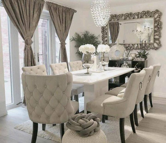 • يحلو اختيار طاولة السفرة المزودة بسطح من الخشب اللماع، باللون البيج أو الأبيض أو الأسود، مع قواعد عبارة عن الـ"كروم" بلون الذهب أو الفضة، على هيئة قضبان، أو 4 قواعد ضخمة.