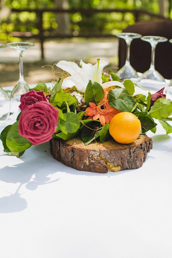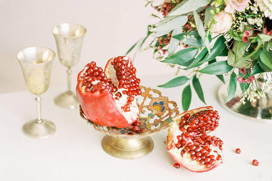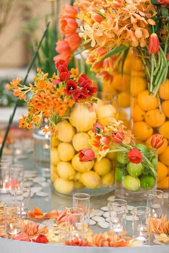 الموضة مثالية لأفراح الصيف والخريف، حيث تزخر الأسواق بالفواكه الملونة كالرمان والبرتقال والمانجو والفراولة، كلها أشكال منعشة وألوان محببة للنظر، وبدون أي ارتفاع عن سطح الطاولة، يمنع الرؤية الواضحة للقاعة. توضع هذه الفواكة كزينة لطاولة الزفاف، بدون أي مزهريات أو أطباق تقديم تقليدية كبيرة، ولكن بطرق مبتكرة سنوضحها فيما يلي: