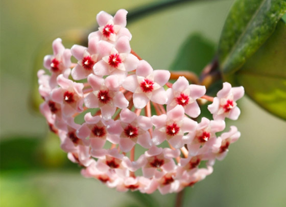 5. نبتة الشمع: هذه النبتة الشمعية تنتج أزهاراً عطرة على شكل نجمة. تحتاج هذه النبتة ضوءاً ساطعاً غير مباشر ويفضل أن يكون بعيداً عن ضوء الظهيرة القاسي، لكن كن حذراً لأن القليل من الضوء يمنعها من الإزهار. تأكد من سقي النبات بانتظام خلال موسم النمو، واترك الجزء العلوي من التربة يجف بين الري. لا تقطع الفروع الطويلة للنبات- هذا هو المكان الذي تتشكل فيه الأوراق الجديدة ومجموعات الزهور.