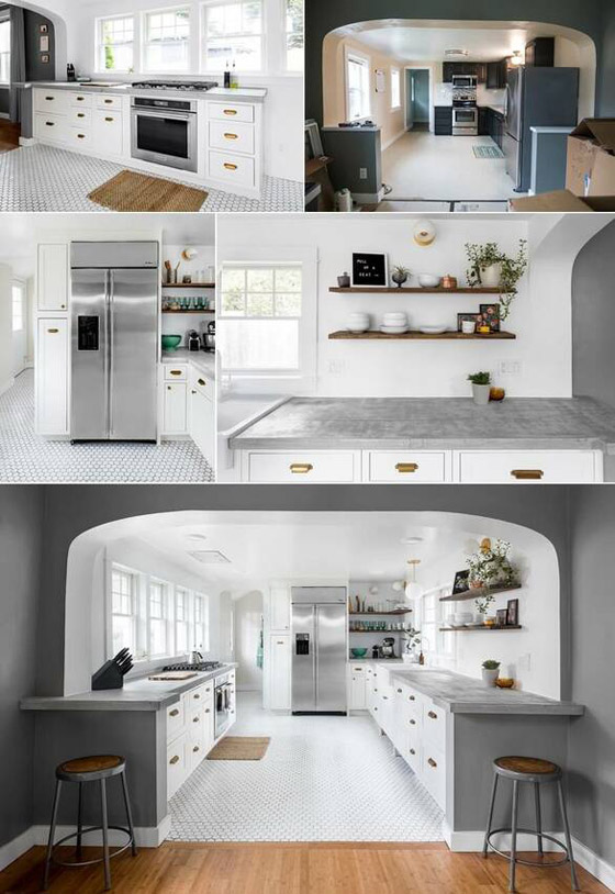 7- طريقة أخرى لتجديد المطبخ بأقل ميزانية، عن طريق طلاء الخزن بلون مختلف وتغيير لون الأرضيات بنفس اللون.