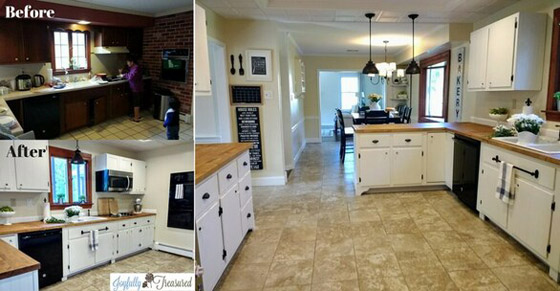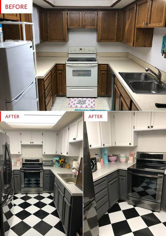9- تجديد مطبخ صغير بطلاء الخزن والجدران وتغيير لون الأرضية.