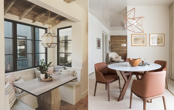 3- نموذج كلاسيكي لزاوية مميزة لتناول وجبة الفطور، باستخدام لوح من الخشب مع مقاعد جلدية.