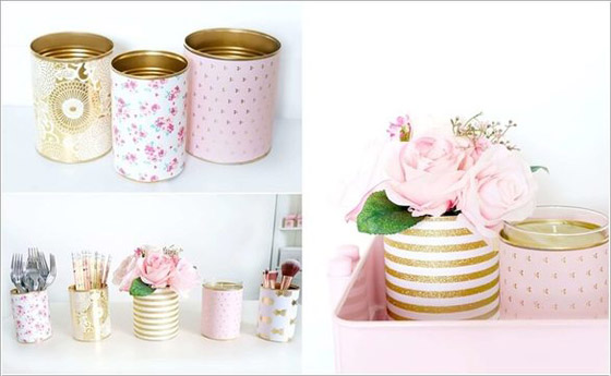 6- إعادة استخدام عبوات الأطعمة المعلبة لوضع الأزهار بعد تغطيتها بورق مزركش.