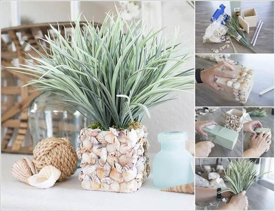 8- تصميم هذه المزهرية الفريدة عن طريق إحاطة صندوق من الخشب أو الكرتون بعدد كبير من الأصداف البحرية.