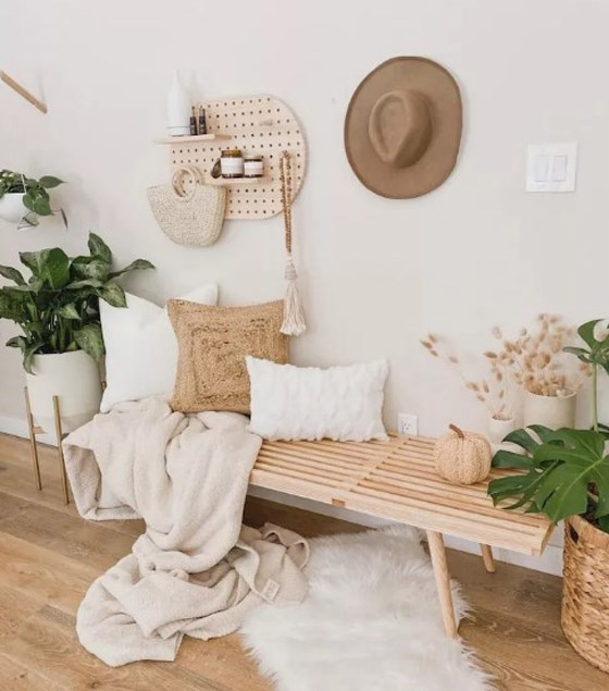 إضافة لما ذُكر، يمكنك بكل ببساطة جعل مدخل المنزل يبدو أكبر من خلال الاستعانة بالمقعد العريض "Bench" إذا أمكن، اختاريه صغيراً ونسقيه مع مرآة معلقة على الجدار خلفه.