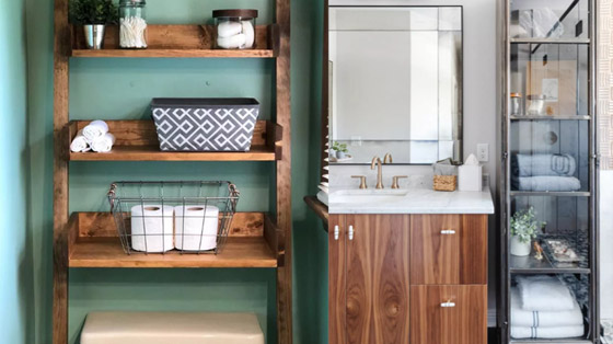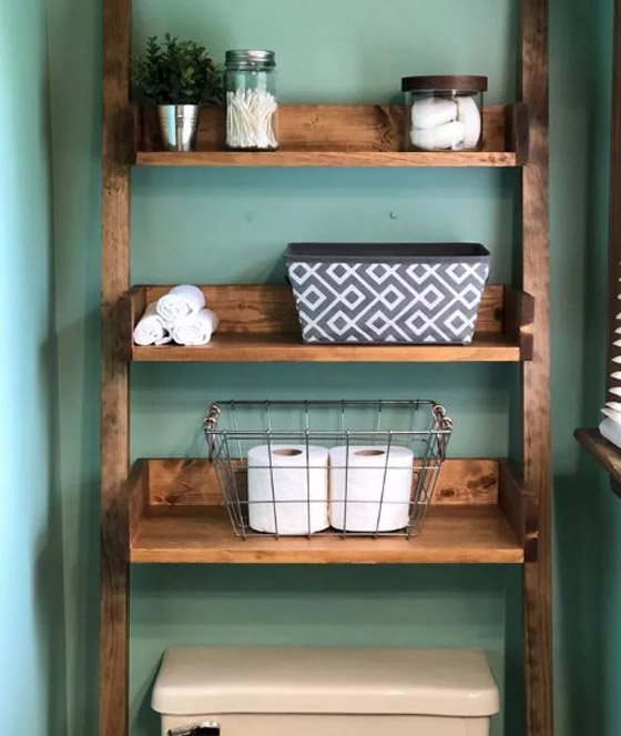 من أسهل الطرق لإضافة رفوف في الحمام، الاستعانة بتصميم السلم في الجدار الخلفي، فذلك يمنحك خيار التخزين المطلوب مع استغلال المساحة.
