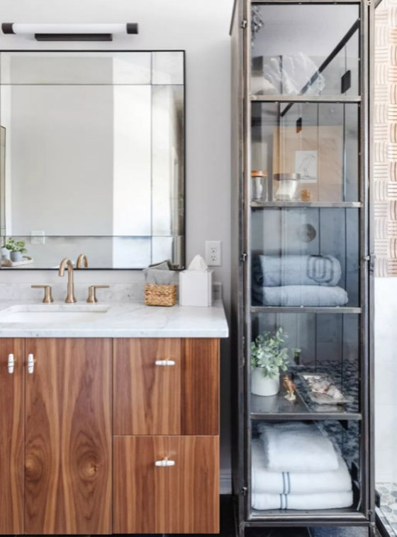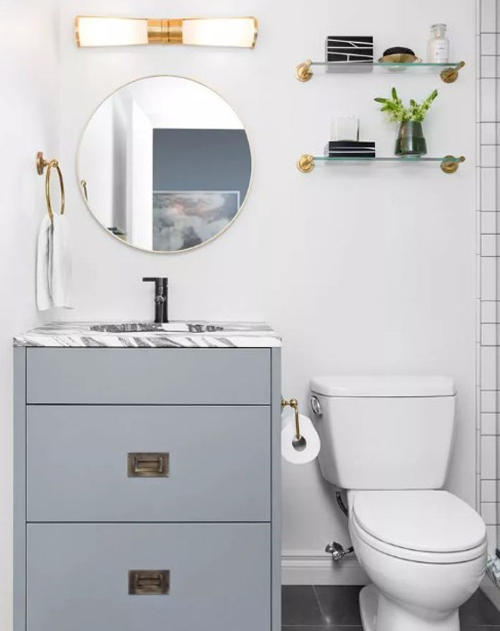 في حال كانت المساحة صغيرة لا تسمح بخزانة أو وحدة خاصة، يمكنك الاستعانة بالرفوف الطائرة في أي جزء من الحمام حسب اختيارك، كما يمكنك اختيار رفوف زجاجية، فذلك المظهر الشفاف سيعزز من المساحة بجانب إضافة لمسة أنيقة.