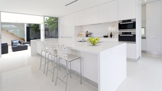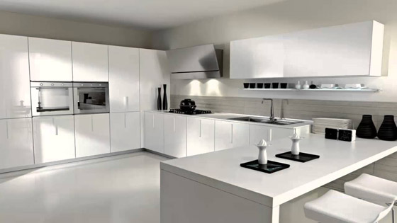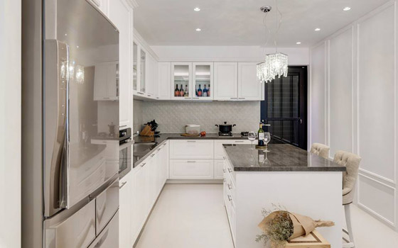 للحصول على تأثير مذهل، يجب أن يحتوي المطبخ الأبيض على خطوط أنيقة وهندسية. وسيساعد التأثير المتناغم للأبواب على الحائط على توسيع المساحة، ويسمح بالجرأة في الأشكال وبسلاسة وتناغم.