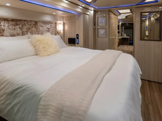 و حصل جوستين على منزل مصمم خصيصًا له، وبتكلفة لا تقل عن 2.5 مليون دولار لإكماله. ويزن منزل Marathon RV Prevost طنًا ويحتاج إلى محرك ديزل فولفو 500 حصان يستخدم أيضًا في القوارب. وفي الداخل، يوجد تسخين تحت الأرض لفصل الشتاء وأربعة أنظمة من تبريد الهواء لأيام الصيف الحارة. و يحتوي المنزل على ثلاث أجهزة تلفزيون ضخمة، وأجود أنواع الجلد الإيطالي والرخام في جميع أنحاء المكان. ويأتي الحمام مع دش وساونا لشخصين. ولكن ربما تكون الميزة الأكثر جنونًا هي موقد الغاز، والذي يجعلك تشعر وكأنك في منزل حقيقي.