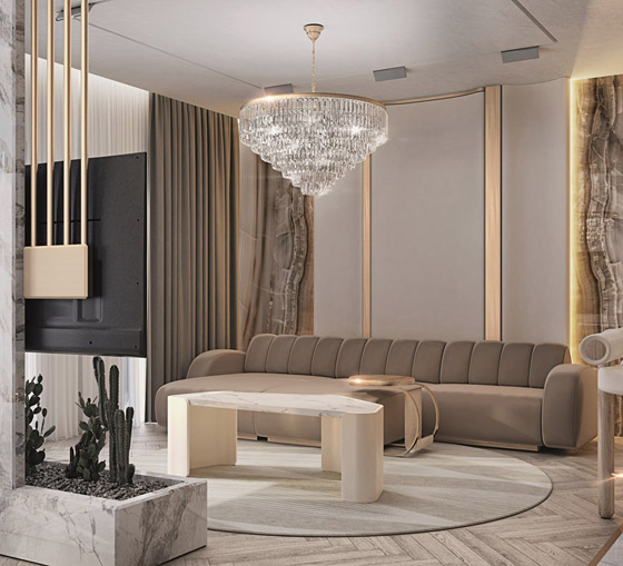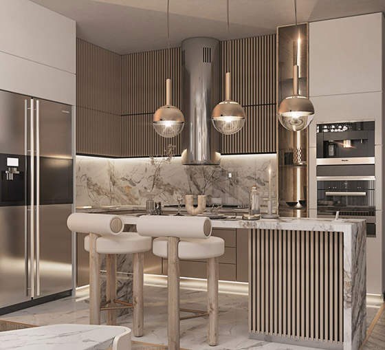 الرخام هو الجوهرة الرائعة، التي تبرز وتمر من خلال ونحو كل ركن من أركان الشقة، خاصة المطبخ، سواء عبر المساحة نفسها أو الجدران أو حتى الأرضية. فالرخام مادة رفيعة ومصقولة، وهو مكان الاجتماع المثالي في أي وقت من اليوم، ويمكن أيضاً استخدامه في غرفة المكتب المنزلية. كما يعد كرسي Freddo، من «Caffe Latte»، قطعة البيان الرئيسية، بالإضافة إلى أناقة ودقة المصباح المعلق.