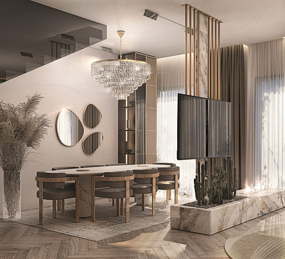 وقت العشاء مقدس؛ لذا إن طاولة الطعام Breve II، وكرسي المائدة Panna، من «Caffe Latte»، هما الرفيقان المناسبان للاستمتاع بالوجبات الساخنة واللذيذة، ما يعزز فكرة أن القليل أكثر، ويوسع نطاق العلامة التجارية إلى Canephora، مرآة أصيلة ومعاصرة. وتحتوي غرفة الطعام، أيضاً، على ثريا Naicca الكريستالية المستديرة، المعقل المعروف للثريات. بلا شك، يهدف هذا التصميم العصري إلى توفير الراحة والوظائف العملية لأي غرفة، مع أسلوب حديث بسيط، مستكملاً جماليات التصاميم الأخرى باستخدام لوحة ألوان محايدة، ما يقدم الرصانة للديكور الداخلي، ويؤدي في النهاية إلى ابتكار تصميم توافقي مناسب لأي ذوق.