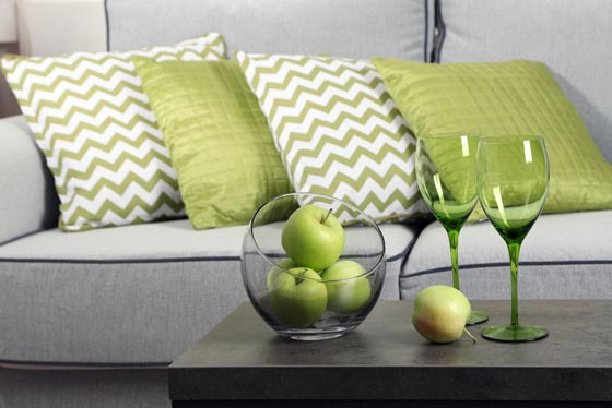 - الأخضر: يريح العين والنفس، ويُستخدم في المساحات الضيّقة، لأنه يمنحها بعدًا بصريًّا أكبر، ويستحضر الطبيعة. ويُحبّذ استخدام اللون الفاتح منه في طلاء جدران أو خزائن المطابخ، أو ضمن الـ"إكسسوارات" فيها.